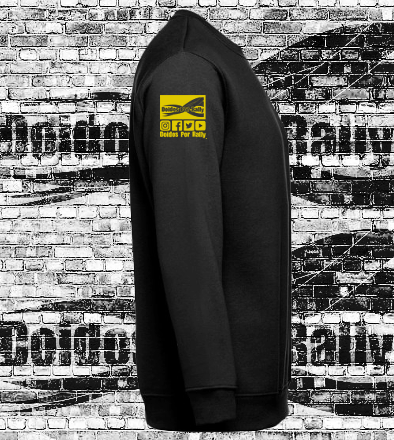 50% algodão, 50% poliéster, com impressão DTF dourado logotipo “Doidos Por Rally”.